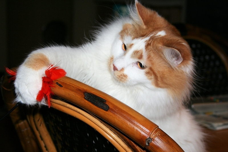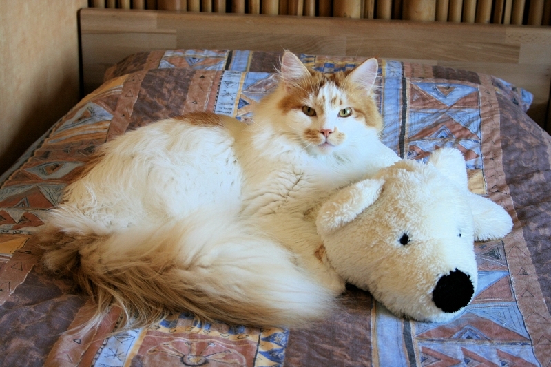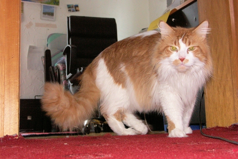 Hier angekommen hatte er dich hoch zur Wohnung getragen, und nachdem die Tür zur Straße zu war, dich erst mal im Esszimmer auf den Boden gesetzt. Alex guckte, das ist aber nicht der Rote, oder? Nein das warst du sicher nicht… Mir hast du aber schon sehr gefallen und vor allen Dingen dein besonderes Wesen und deine Art, die Dinge hier anzugehen. Gleich auf den Katzenklo, dann zum Wassernapf und schon mal an der Futtermatte gerochen… Was man so alles nach langer Fahrt einfach macht. Danach bist du hoch auf den großen Kratzbaum, hattest es dir gemütlich gemacht und dem Rot, oder nicht Rot Kater Gespräch gelauscht. Sanny hatte den Roten schon vorher verkauft, das Foto aber nicht aus ihrer Homepage entfernt. So bist du dann, als letzte Katze deines Wurfes, hier bei uns gelandet. Das es dir hier bei uns sehr gut gefallen hatte, war offensichtlich und klar war da auch schon, dass du sicher bei uns bleibst. Ja, dann mussten wir jetzt nur noch die anderen vier Katzen davon überzeugen, dass du bleibst. Gefreut hatten die sich zuerst nicht sonderlich, aber nach ein paar Tagen ging alles seinen Gang. Die Chefinnen und Chefs setzten ihre neuen Grenzen und du wurdest erst einmal gemobbt.