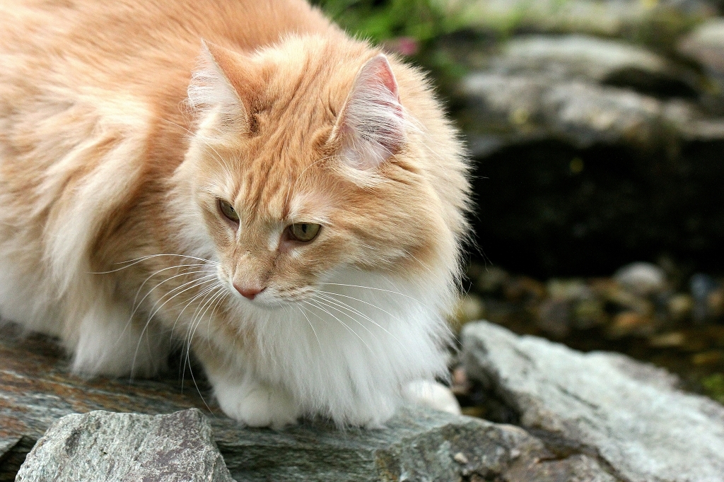 Candy war dann die fünfte Norwegische Waldkatze der Mang`s! In der Regel schaue ich seither so zweimal im Jahr vorbei und mache immer mal neue Fotos von den Katzen. Am Anfang gestaltete es sich ziemlich schwierig, da die Katzen nur kontrolliert und angeleint raus in den Garten kamen. Zum fotografieren allerdings wurde die Leine, zumindest zeitweise, entfernt und es war schon etwas schwierig alle Katzen gleichzeitig im Auge zu behalten. Die großen Entdecker waren oft urplötzlich aus dem Blickwinkel. Da das Grundstück nur sehr niedrig eingezäunt ist und auf der südlichen Seite, zum Nachbarn, in einer Natursteinmauer endet, kam es häufig vor, das Michael und ich auf die Suche in der näheren Umgebung gegangen sind. Das hatte einige Zeit in Anspruch genommen, aber wir wurden eigentlich immer fündig, oder die Katze war schon alleine wieder zurückgekehrt als wir entnervt zum Haus zurückkehrten. Ein sichern des Grundstücks mit einem höheren Zaun ist dort, auch wegen der Nachbarn kaum möglich und so blieb nur eine neue Idee, auf die Michael dann nach einiger Zeit kam. Er hatte sich von seinem Hauselektriker ein Induktionskabel entlang des Zauns unter die Erde verlegen lassen und alle Katzen tragen jetzt dazu passende Halsbänder. Nähert sich eine Katze dem Zaun zu sehr, werden impulsartig sanfte Stromstöße für die Katze fühlbar. Dies steigert sich dann noch, bis die Grenze erreicht ist und es unangenehm für die Katzen wird. Das ist besser als die bekannten Stromkabel aus Zoos, da dort doch ziemliche heftige Stromstöße auf die Tiere einwirken. Allerdings müssen diese gut sichtbaren Halsbänder während des fotografieren natürlich abgenommen werden und da die Katzen das gewohnt sind, das es zur Grundstücksgrenze hin doch etwas unangenehm wird, behält man das auch ohne Halsband in Erinnerung, zumindest kurzzeitig! 2017 kam dann noch Kater Yobbo zur Gruppe hinzu, er hat die Farbgebung black-white und trifft damit wieder meinen speziellen Geschmack. Jetzt sind es sechs Katzen bei Susanne und Michael und die Gruppe funktioniert nach wie vor recht gut. Ich werde auch weiterhin Fotos von ihnen machen und weiterhin viel Spaß dabei haben. Denke also das es im Frühjahr 2019 wieder neue Fotos von den Norwegern geben wird. Über ein Honorar sprechen wir heute nicht mehr, zumal Michael auch noch eine Patenschaft für eine Wildkatze übernommen hat und mir es Freude macht sie zu fotografieren.